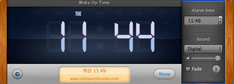 Wake Up Timeを開くとデジタル時計に現在時刻が表示されます。時計のフレームの右側をマウスでドラッグすると、Alarm timeやSoundを設定できますので、目覚めたい時間をセットし、3つの音から快適かつ確実に目が覚ませそうな音を選びましょう。すぐに眠るときは、時計右下の「Sleep」をクリックします。すると、Macの画面もスリープ状態になりますので、休憩に入りましょう。「Sleep」をクリックしなければ画面はスリープ状態にはならないので、出かける時間の10分前にセットして時間を管理するといった使い方もできます。